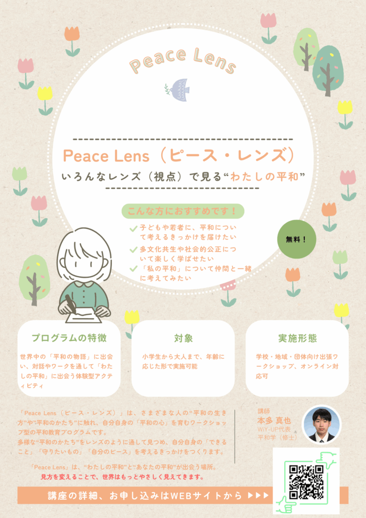 WiY-UPが提供する「Peace Lens(ピース・レンズ)」は、さまざまな人の“平和の生き方”や”平和のかたち”に触れ、自分自身の「平和の心」を育むワークショップ型の平和教育プログラムです。